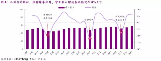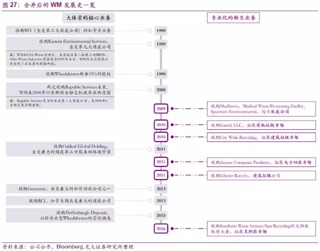 公司核心業(yè)務(wù)在美國已占據(jù)領(lǐng)先地位,合并后,公司先是迅速拿下了BFI(全美第二大固廢公司)的加拿大全部業(yè)務(wù),緊接著又收購了全美第九大固廢公司Eastern Environmental Services。公司在穩(wěn)固開展自有優(yōu)勢(shì)垃圾收運(yùn)業(yè)務(wù)的基礎(chǔ)上,先是在1999年收購公司垃圾焚燒領(lǐng)域支柱Wheelabrator的剩余33%股權(quán),隨后分別在2011年、2013年收購全美最大的固廢第三方服務(wù)運(yùn)營(yíng)商Oakleaf Global Holding和私營(yíng)回收公司Greenstar,穩(wěn)固提高公司在垃圾收運(yùn)、垃圾轉(zhuǎn)運(yùn)、以及垃圾回收等核心業(yè)務(wù)上的領(lǐng)先地位。