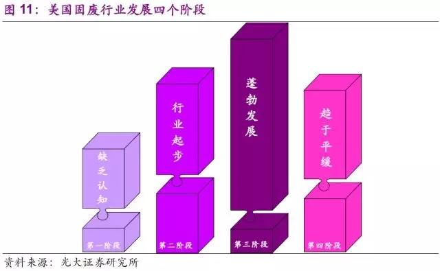 美國固廢行業(yè)伴隨著美國整體的經(jīng)濟(jì)的發(fā)展變化經(jīng)歷了“缺乏認(rèn)知”(兩次工業(yè)革命—1930s),“行業(yè)起步”(1930s—二戰(zhàn)結(jié)束),“蓬勃發(fā)展”(二戰(zhàn)結(jié)束—1980s)和“趨于平緩”(1980s—至今)的四個(gè)階段。經(jīng)過比較分析,我們認(rèn)為第三第四階段更貼合中國的實(shí)際并且可以發(fā)掘出參考意義,所以我們將著重描述“蓬勃發(fā)展”和“趨于平緩”兩個(gè)階段。