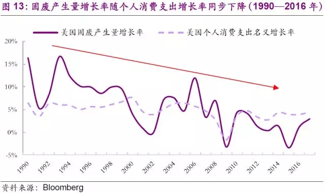 二戰(zhàn)后,美國新技術(shù)革命的推動(dòng)(主要原因)與國民經(jīng)濟(jì)的軍事化(越南戰(zhàn)爭(zhēng))極大地刺激了經(jīng)濟(jì)的增長(zhǎng)。利用戰(zhàn)后經(jīng)濟(jì)優(yōu)勢(shì)地位和國外廉價(jià)資源(石油等),美國的現(xiàn)代跨國公司大力拓展世界市場(chǎng),極大地獲取高額利潤(rùn),使得美國國內(nèi)經(jīng)濟(jì)持續(xù)發(fā)展,西部和南部呈現(xiàn)繁榮之象并且造就了一個(gè)黃金時(shí)代。高速發(fā)展的黃金時(shí)期,美國居民生活水平持續(xù)提高,個(gè)人消費(fèi)增速明顯,進(jìn)而帶動(dòng)固廢量持續(xù)走高,這段時(shí)期也是固廢行業(yè)蓬勃發(fā)展的第三階段。