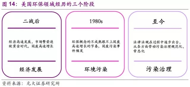 和其他發(fā)達(dá)國家一樣,美國在環(huán)保領(lǐng)域同樣經(jīng)歷了“經(jīng)濟(jì)發(fā)展—環(huán)境污染—污染治理”這一過程,而這三者之間的脈絡(luò)基本對(duì)應(yīng)固廢行業(yè)的第三,四階段。在這兩個(gè)階段之前美國出臺(tái)的一系列法規(guī),先后幫助固廢行業(yè)的完善成長(zhǎng)以及促使其朝著平穩(wěn)可持續(xù)健康的發(fā)展業(yè)態(tài)前進(jìn)。