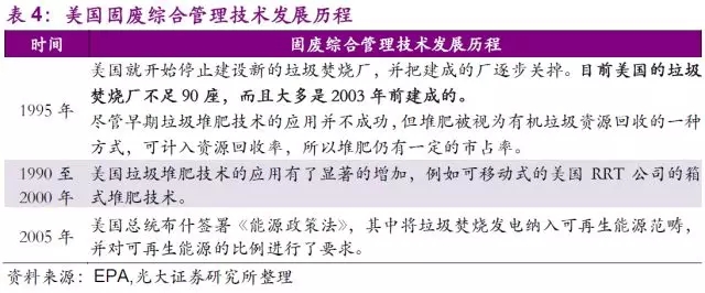 固廢行業(yè)的技術(shù)發(fā)展同樣是制約市場(chǎng)和公司發(fā)展的另一個(gè)決定性因素。早在1940年,美國公共衛(wèi)生署(USPHS)便開始推行了一系列固廢處置的技術(shù)性試驗(yàn),從“衛(wèi)生填埋代替露天堆放”,到“垃圾堆肥的探索和試驗(yàn)”,再到“垃圾焚燒”,最后到了如今大力推廣的“廢物能源回收”的綜合利用。