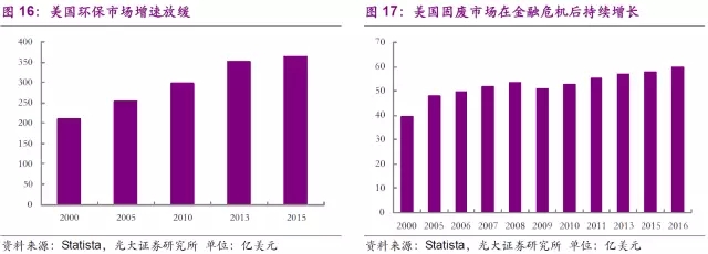 隨著環(huán)保處置設(shè)施要求的日益提升,環(huán)保市場(chǎng)也在穩(wěn)步擴(kuò)大。美國環(huán)保市場(chǎng)從2000年的2090億美元發(fā)展到2015年的3631億美元,但增速近年來有所放緩。固廢市場(chǎng)在2009年受金融危機(jī)影響有所下滑后,重回增長(zhǎng)軌道。