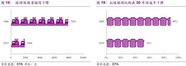 固廢行業(yè)蓬勃發(fā)展也帶來了處置方式的變化。隨著一系列垃圾填埋場(chǎng)污染事件的發(fā)生,美國公眾對(duì)于垃圾隨意填埋這種簡(jiǎn)單粗暴處置方式的不滿因信息化網(wǎng)絡(luò)化的發(fā)達(dá)而被無限放大。多方因素導(dǎo)致美國政府逐步關(guān)停垃圾填埋場(chǎng)并減少垃圾填埋量。美國的城市固體廢物填埋場(chǎng)從1988年的7924座逐步減少為2012年的1908個(gè),送至垃圾填埋場(chǎng)的垃圾占比也由1989年的89%下降到2014年的52%左右。