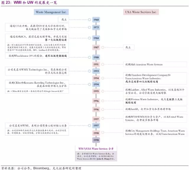 縱觀WM的發(fā)展史,兼并和收購一直貫穿其中。改變公司歷史的一次兼并發(fā)生在1998年,公司與USA Waste Services Inc.(以下簡(jiǎn)稱UW)合并,新公司名稱保留為Waste Management。值得注意的是,本次兼并的提出方并不是當(dāng)時(shí)全美第一的固廢龍頭WM提出,而是由當(dāng)時(shí)全美第三的UW提出兼并,同時(shí)新公司的CEO也由原UW的CEO擔(dān)任。為了更好的分析WM的并購發(fā)展,我們將分別研究WM(合并后),原WM(以下簡(jiǎn)稱WMI),以及UW分別的發(fā)展并購史。