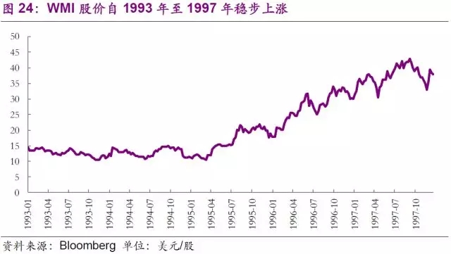 進(jìn)入90年代,公司不滿足于現(xiàn)有的業(yè)務(wù)模式,意圖通過繼續(xù)的并購開拓多元化市場(chǎng)。然而結(jié)果卻超出了公司的預(yù)想。公司于1993年更名為WMX Technologies,意在體現(xiàn)公司多元化的業(yè)務(wù)范圍。通過收購,公司先后進(jìn)入危廢、石棉移除、金屬腐蝕處理、甚至是草坪養(yǎng)護(hù)市場(chǎng)。與之前的垃圾焚燒和垃圾回收不同的是,上述行業(yè)在初期均需要大量資金投入,回報(bào)卻極其有限。公司的多領(lǐng)域擴(kuò)張?jiān)谝婚_始收到了回報(bào),股價(jià)從1993年初的8.87美元一路上揚(yáng)至1997年初的18.86美元,漲幅達(dá)112%。