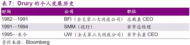 值得一提的是UW高速發(fā)展的源動(dòng)力,公司CEO John E.Drury。作為Browning-Ferris Industries(以下簡(jiǎn)稱“BFI”)的總裁兼COO,Drury用了10年時(shí)間引領(lǐng)BFI成為全美第二大固廢公司的位置,然而因?yàn)椴唤邮芄綜EO大力發(fā)展垃圾回收行業(yè)的決定,離開公司并于1994年擔(dān)任UW的CEO。Drury僅花了3年時(shí)間,通過1995年的5次大型收購,以及1996年的30次小型收購,將公司的營(yíng)業(yè)收入從1994年的434萬美元大幅增長(zhǎng)至1997年的26億美元,增速高達(dá)598倍。