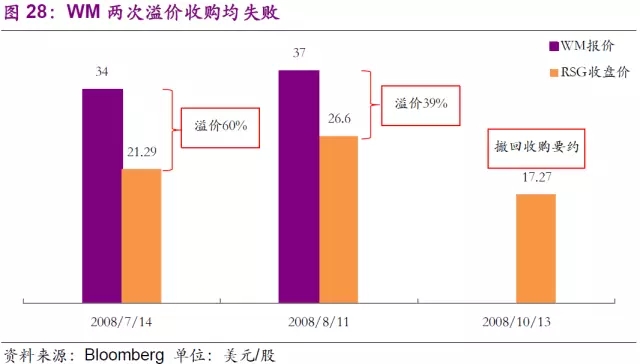 值得注意的是公司發(fā)起收購的時(shí)間。2008年6月23日,RSG宣布將與Allied Waste合并,而當(dāng)時(shí)Allied Waste和RSG分別是美國第二、第三大固廢公司。消息宣布后一個(gè)月內(nèi),WM就向RSG提出了收購要約,但未能實(shí)現(xiàn)。