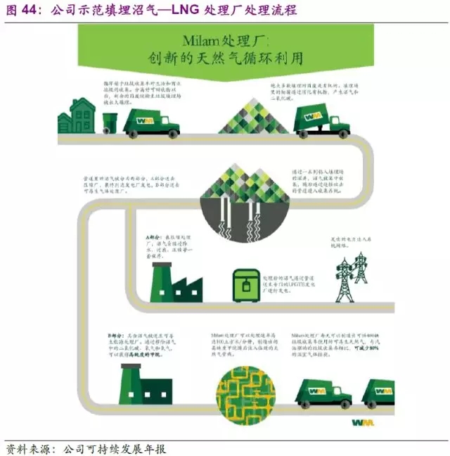 在此基礎(chǔ)上,公司也在領(lǐng)先研究填埋沼氣—天然氣的市場(chǎng)化進(jìn)程。公司先是于2005年在加州建立了全球最大的填埋沼氣—LNG處理廠,隨后分別于2014和2016年在俄亥俄州和伊利諾伊州建立了兩座填埋沼氣—壓縮天然氣處理廠。上述天然氣的產(chǎn)出在兩方面得到利用:一是用于公司自有的垃圾收集車(40%),二是進(jìn)入天然氣管網(wǎng)銷售,在降低公司運(yùn)營(yíng)成本的同時(shí)也提供了一定營(yíng)收。