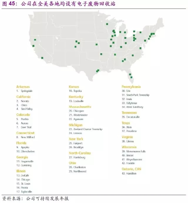 在電子廢物回收業(yè)務(wù)加速發(fā)展的同時(shí),其他危廢處理也是公司關(guān)注的重點(diǎn)。公司的“At Your Door Special CollectionSM”正是專門為居民用戶處理危廢而推出的一站式服務(wù)。包括車用產(chǎn)品、電池、園林化學(xué)物質(zhì)、特別是熒光燈等危廢均可通過公司專用的危廢收集車上門收取。公司的固廢收集車(包括危廢)也是公司的一大亮點(diǎn),截止2016年,已有多達(dá)18500輛使用天然氣驅(qū)動(dòng),在為環(huán)保服務(wù)的同時(shí)也真正做到了自我環(huán)保價(jià)值的體現(xiàn)。