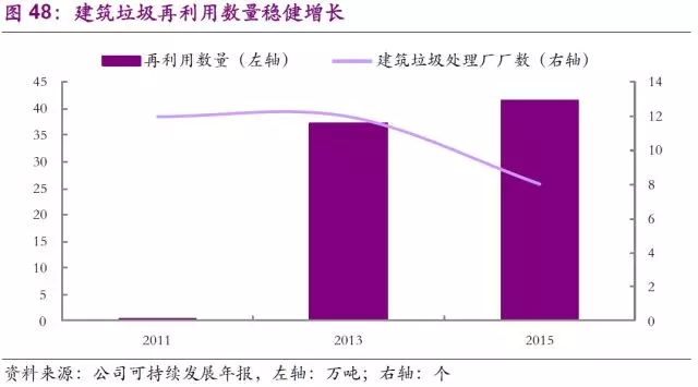 早在2000年初,公司便積極發(fā)展建筑垃圾的回收工作。公司在2009年至2014年間,通過10余家建筑垃圾回收廠占據(jù)了穩(wěn)定市場(chǎng)份額,建筑行業(yè)的季節(jié)性高峰特性也為公司在夏季的營(yíng)業(yè)收入做出了可觀貢獻(xiàn)。而在2011年,公司又創(chuàng)新式的推出了“分散回收跟蹤工具”,通過跟蹤使用在工程中的重復(fù)利用建筑材料,幫助工程項(xiàng)目方更好地完成綠色建筑的目標(biāo)。截止2015年,通過跟蹤工具的幫助,已有多達(dá) 41萬噸的建筑垃圾得到回收或再利用,比2013年的37萬噸增長(zhǎng)10%。