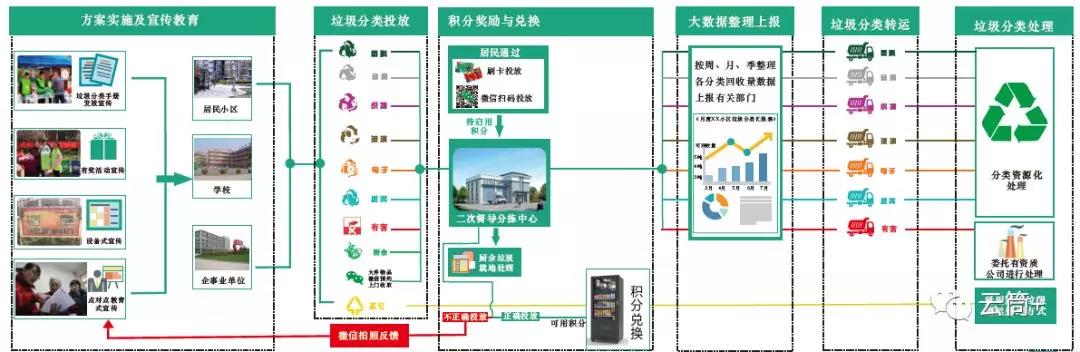 告別傳統(tǒng)的四分類(餐廚、有害、可回收、其他),采用更精細(xì)的細(xì)分類模式,是為了將分類工作落到實(shí)處,告別空談。并以多種顏色區(qū)別不同分類,使得分類更直觀,清晰明了,達(dá)到教育意義。通過(guò)積分回饋的方式帶動(dòng)居民垃圾分類的積極性,使得各分類垃圾價(jià)值達(dá)到最大化。