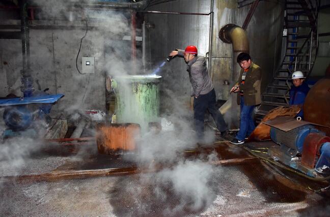 2017年2月19日晚,環(huán)境保護(hù)部2017年第一季度空氣質(zhì)量專項(xiàng)督查第13督查組督查人員在企業(yè)生產(chǎn)車間檢查。攝影/章軻