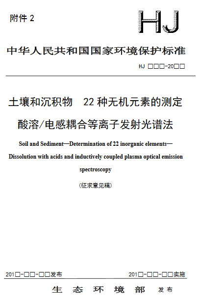 為貫徹《中華人民共和國環(huán)境保護(hù)法》,保護(hù)與控制土壤環(huán)境質(zhì)量,保障人體健康,規(guī)范土壤沉積物中無機元素的測定方法,生態(tài)環(huán)境部印發(fā)《土壤和沉積物 22種無機元素的測定 酸溶/電感耦合等離子發(fā)射光譜法(征求意見稿)》,詳情如下: