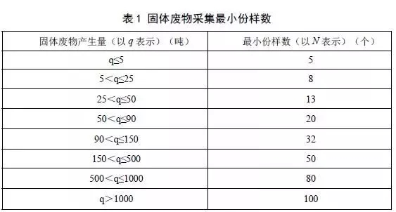 b)間歇產(chǎn)生固體廢物時(shí),如固體廢物產(chǎn)生的時(shí)間間隔小于一個(gè)月,應(yīng)以確定的工藝環(huán)節(jié)一個(gè)月內(nèi)的固體廢物最大產(chǎn)生量為依據(jù),按照表1確定需要采集的最小份樣數(shù)。如固體廢物產(chǎn)生的時(shí)間間隔大于一個(gè)月,以每次產(chǎn)生的固體廢物總量為依據(jù),按照表1確定需要采集的份樣數(shù)。