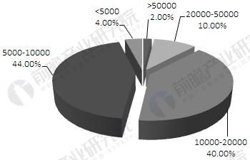 報(bào)廢汽車回收拆解企業(yè)按汽車回收量規(guī)模分布圖(單位:輛,%)