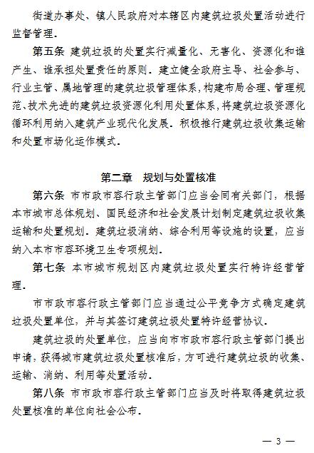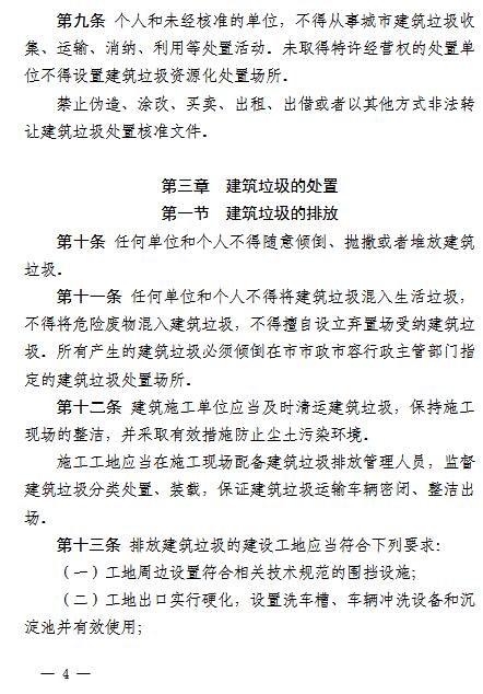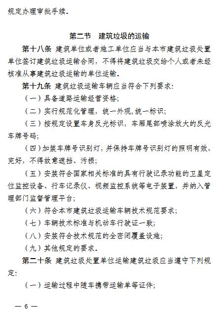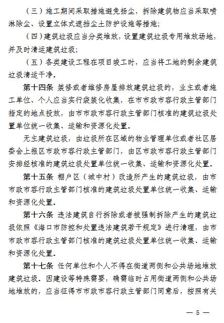 《辦法》要求,在建筑垃圾的排放上,任何單位和個人不得隨意傾倒、拋撒或者堆放建筑垃圾,不得將建筑垃圾混入生活垃圾,不得將危險廢物混入建筑垃圾,不得擅自設立棄置場受納建筑垃圾。因建設等特殊需要,確需臨時占用街道兩側和公共場地堆放的,應當征得??谑惺姓腥菪姓鞴懿块T同意后,按照有關規(guī)定辦理審批手續(xù)。裝修或者維修房屋排放建筑垃圾的,應當實行袋裝化收集;無主建筑垃圾,由垃圾所在區(qū)域的物業(yè)管理單位或者社區(qū)居委會上報各區(qū)市政市容行政主管部門;棚戶區(qū)(城中村)改造所產生的建筑垃圾,由??谑姓腥菪姓鞴懿块T核準的建筑垃圾處置單位統(tǒng)一收集、運輸和資源化處置。