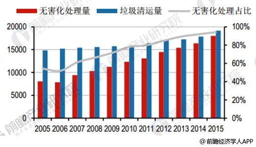 截至2015年底,全國(guó)城市范圍內(nèi)生活垃圾焚燒占比已達(dá)37.97%,其余城市生活垃圾以衛(wèi)生填埋或其它形式進(jìn)行無(wú)害化處理。2005年至2015年的十年間,我國(guó)生活垃圾清運(yùn)量及無(wú)害化處理率不斷提高,焚燒占無(wú)害化處理的比重增長(zhǎng)超過(guò)3倍。