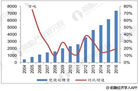 2004-2016年城市生活垃圾焚燒處理量及增速情況