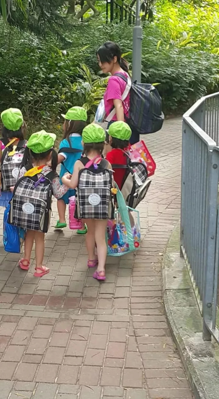 回去的路上,統(tǒng)一著裝的孩子們各自拎著自己的物品,手拉手,相互照顧,安靜地跟在老師身后。