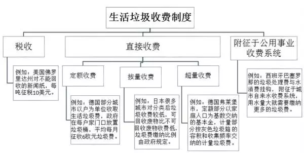 國際上,生活垃圾收費(fèi)制度主要包括三種類型:稅收方式、直接收費(fèi)方式和附征于公用事業(yè)收費(fèi)系統(tǒng)方式。