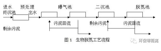 在污水的生物脫氮處理過程中,首先在好氧條件下,通過好氧硝化菌的作用 ,將污水中的氨氮氧化為亞硝酸鹽或硝酸鹽 ;然后在缺氧條件下,利用反硝化菌(脫氮菌)將亞硝酸鹽和硝酸鹽還原為氮?dú)舛鴱奈鬯幸莩?。因?污水的生物脫氮包括硝化和反硝化兩個階段。生物脫氮工藝流程見圖1 。