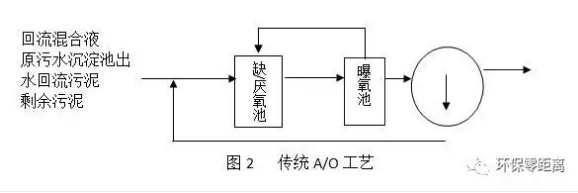A/O脫氮除磷系統(tǒng),即缺氧、好氧脫氮除磷系統(tǒng)。它是70年代主要由美國、南非等國開發(fā)的具有去除廢水中氮污染物的工藝,同時(shí)對脫磷亦有一定的效果。其工藝流程是讓廢水依次經(jīng)歷缺氧、好氧兩個階段,故人們通稱為缺氧、好氧脫氮除磷系統(tǒng),簡稱A/O系統(tǒng)。A/O系統(tǒng)流程簡單、運(yùn)行管理方便,且很容易利用原廠改建,從而提高了出水水質(zhì)。近年來已得到了越來越廣泛的應(yīng)用。A/O法工藝如圖2所示。