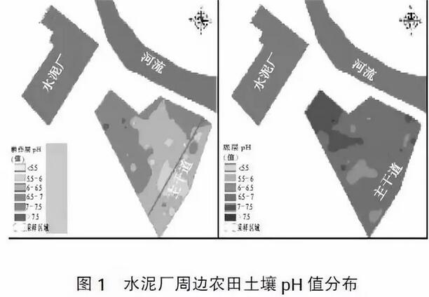 統(tǒng)計分析結果表明,上層土壤(0~20cm)pH 值在5.3~7.7 之間波動,均值為6.50,下層土壤(20~40 cm)pH 值在6.14~7.65 之間波動,均值為6.81。整體情況看,上層土壤pH 值整體低于下層,表層土壤變幅在1~2 個單位,下層土壤降幅為0.3 個單位左右。空間變異結果表明(見圖1),水泥廠附近的農(nóng)田土壤pH 值整體在7 左右,距離水泥廠越遠農(nóng)田土壤pH 值越低,但該區(qū)域靠近公路,公路對該區(qū)域農(nóng)田土壤pH 值降低影響較大,而且隨著影響時間的延長,底層土壤也受到了影響。