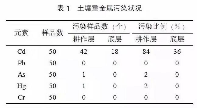 土壤重金屬全量含量描述性統(tǒng)計結果如表2 所示。該區(qū)域土壤中Cd 超標最為嚴重,耕層土壤中Cd 含量是底層的1.6 倍,表明造成該區(qū)域Cd 超標主要來自外源污染。所有樣點土壤Pb 都沒有超標,但是耕作層土壤Pb 含量大于底層,如耕作層土壤最高含量達91.8 mg/kg,表明有外來污染源造成Pb 含量超標。耕作層土壤中Hg 含量也高于底層,表明Hg污染也存在很大的環(huán)境污染風險。