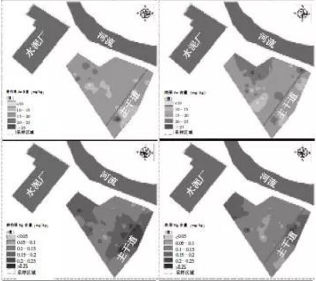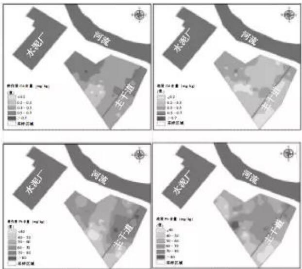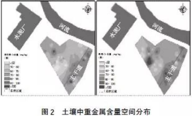 插值結果表明,該區(qū)域農(nóng)田土壤重金屬含量以水泥廠和公路為中心呈輻射狀分布。地統(tǒng)計學研究方法可以對區(qū)域土壤污染源的識別加以指導和檢驗。由于污染場地周邊農(nóng)田土壤重金屬含量的超標與周邊污染源的影響密切相關,因此要密切關注污染源對周邊農(nóng)田土壤重金屬的污染問題。