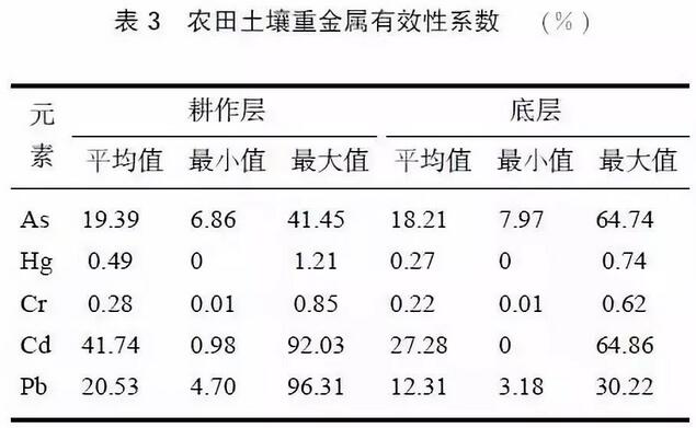 分析土壤重金屬有效性系數(shù)(有效態(tài)含量占全量百分比)(見表3),得出耕作層土壤中5 種重金屬的有效性系數(shù)平均值都大于底層,也表明耕作層Pb、Cd、Cr、As、Hg 受外源污染風險較大。而且由于大氣酸沉降等原因造成的表層土壤酸化,也是導致重金屬活性升高的原因之一。