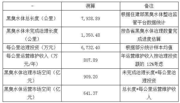 黑臭水體治理、運營市場空間測算