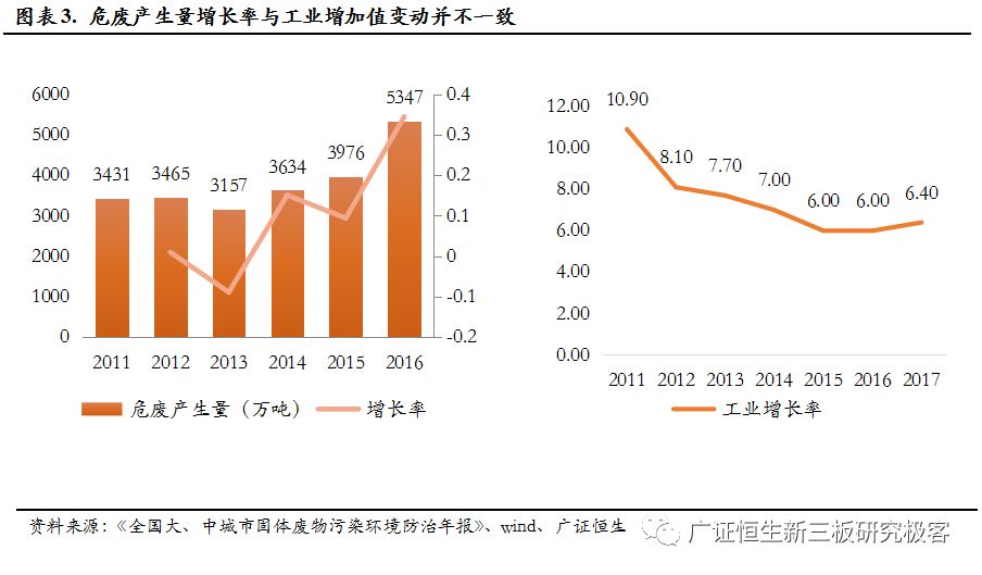 從上圖可以看出,危廢的產(chǎn)生量與工業(yè)的增加值不完全一致,工業(yè)增加值相對(duì)平穩(wěn),而危廢的增加量則跳躍性較大,主要有兩方面的原因:
