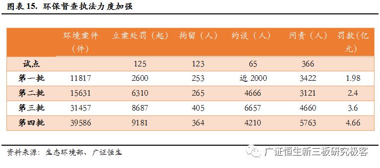 環(huán)保督察執(zhí)法力度逐步趨嚴(yán),罰款從第一批的1.98億元上升到第四批的4.66億元。截 至 9 月 15 日,第四批中央環(huán)保督察組交辦的環(huán)境舉報(bào),立案處罰9181家,罰款4.66億元;立案?jìng)刹?97件,行政和刑事拘留364人;約談4210人,問(wèn)責(zé)5763人。