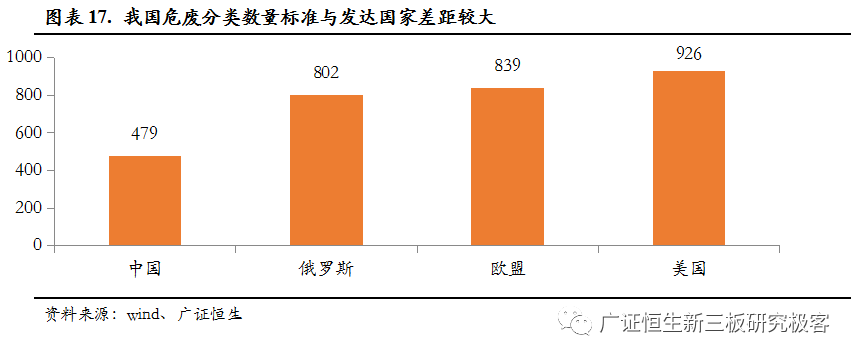 二是環(huán)保標(biāo)準(zhǔn)的提升。2016年,我國(guó)危廢名錄名錄從400種增加至479種,與發(fā)達(dá)國(guó)家相差較遠(yuǎn),其中美國(guó)926種,歐盟839種。