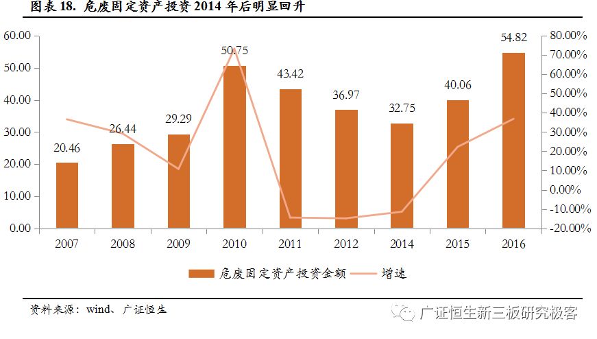 對(duì)危廢巨大的處理需求促使我國(guó)危廢方面的投入持續(xù)增加,尤其是在2014年之后,出現(xiàn)了明顯的回升。