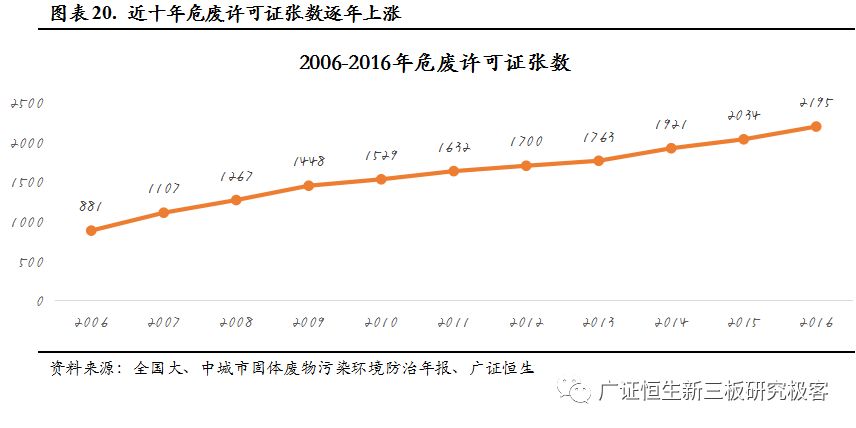 截止2016年底,我國(guó)各省市頒發(fā)的危廢許可證共2195份,相比2006年,數(shù)量增長(zhǎng)149%, 2016年危廢僅增加161張。