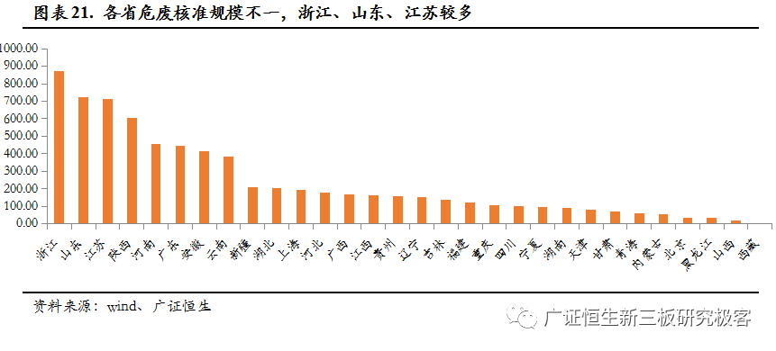 我國(guó)危廢供給高度管制,我國(guó)危廢行業(yè)采用核準(zhǔn)許可證的方式,核準(zhǔn)許可證包括處理范圍及核準(zhǔn)產(chǎn)能,截止2016年底,我國(guó)各省市頒發(fā)的危廢許可證共2195份,危廢核準(zhǔn)規(guī)模為6471萬(wàn)噸,與我們推測(cè)的危廢產(chǎn)生量有一定差距。