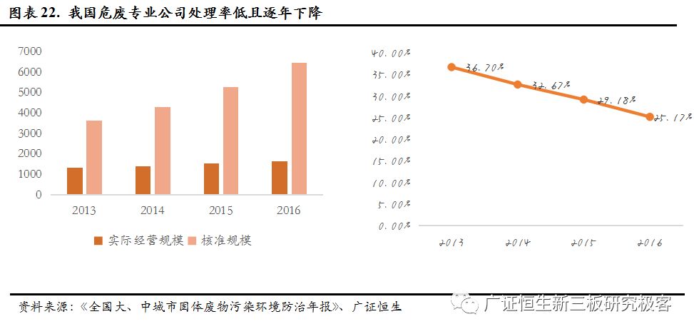 雖然核準(zhǔn)產(chǎn)能足以覆蓋環(huán)保部披露的危廢統(tǒng)計(jì)量,但是與推測(cè)的數(shù)據(jù)相差較大,同時(shí),危廢專業(yè)化公司的處理率低且持續(xù)下滑,2016年產(chǎn)能利用率僅25.17%。