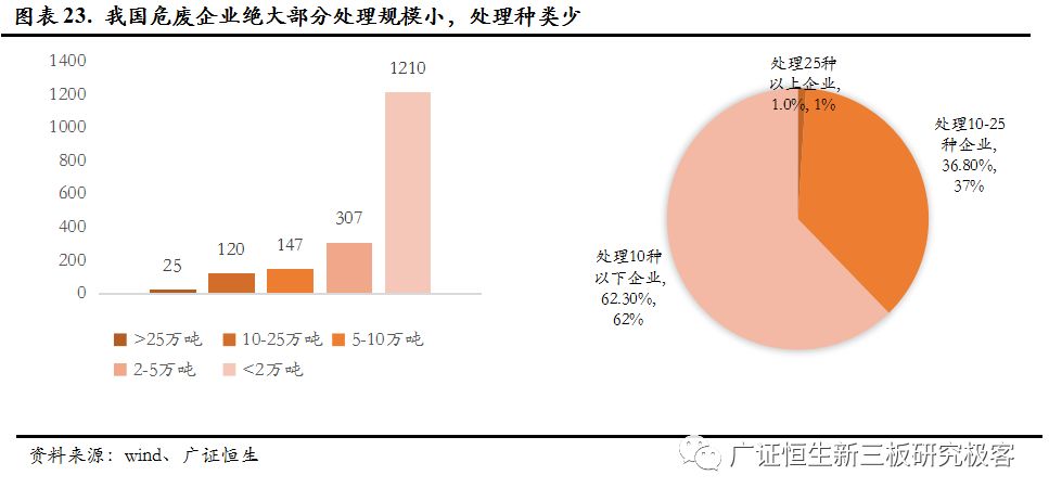 (1) 技術(shù)壁壘高。危廢品類眾多,不同產(chǎn)品處理方式區(qū)別很大,我國(guó)危廢企業(yè)都偏小,無(wú)法完成技術(shù)積累以獲得更多資質(zhì)。