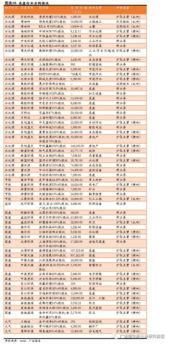 進(jìn)軍新業(yè)務(wù)的案例有24家,方向?yàn)槲U、工業(yè)環(huán)保以及環(huán)保設(shè)備,其中危廢高達(dá)9家,工業(yè)污水2家,設(shè)備4家,為并購(gòu)的主要方向,這也與危廢跟工業(yè)環(huán)保有比較高的技術(shù)壁壘相關(guān)。