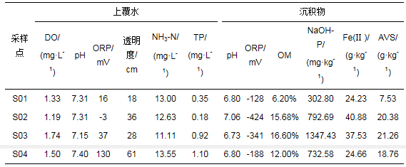 水和沉積物樣品的基本理化性質(zhì)見(jiàn)表 1.由表中可見(jiàn),所有樣點(diǎn)的DO濃度均低于2.0 mg ˙ L-1,氨氮濃度均遠(yuǎn)遠(yuǎn)高于2.0 mg ˙ L-1,屬于劣Ⅴ類水體.根據(jù)《城市黑臭水體整治工作指南》中劃定的城市黑臭水體污染程度分級(jí)標(biāo)準(zhǔn),各樣點(diǎn)的DO和氨氮濃度均處于輕度黑臭級(jí)別.S01、S02、S03 3個(gè)樣點(diǎn)水體的ORP處于輕度黑臭級(jí)別,S01樣點(diǎn)的透明度處于輕度黑臭級(jí)別,其他樣點(diǎn)的透明度均高于輕度黑臭等級(jí)標(biāo)準(zhǔn).鞋底沙河的S03、S04樣點(diǎn)TP濃度遠(yuǎn)高于穗豐年河的TP濃度.