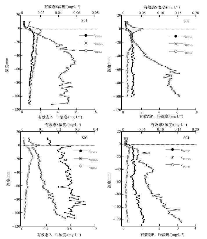 根據(jù)有效態(tài)P、Fe、S在界面附近的高分辨濃度分布計(jì)算得到相應(yīng)的界面擴(kuò)散通量,見(jiàn)圖 4.由圖可知,除S03樣點(diǎn)的有效態(tài)P擴(kuò)散通量為負(fù)值外,其他樣點(diǎn)均為正值,擴(kuò)散通量在0.027~9.077 mg ˙ m-2 ˙ d-1之間,表明沉積物-水界面的有效態(tài)P為由沉積物向上覆水釋放.S03樣點(diǎn)的有效態(tài)P擴(kuò)散通量為-1.076 mg ˙ m-2 ˙ d-1,表現(xiàn)為上覆水向沉積物中擴(kuò)散,導(dǎo)致這一現(xiàn)象的發(fā)生既有外部的原因也有內(nèi)部的原因.外部的原因可能是外源磷的輸入導(dǎo)致上覆水中的P含量增加,從而促使沉積物-水界面兩側(cè)的濃度勢(shì)增加,上覆水中的P易向沉積物中遷移.內(nèi)部的原因可能是該樣點(diǎn)水位較淺,表層沉積物受水動(dòng)力擾動(dòng)機(jī)會(huì)較多,反映在水體中的懸浮顆粒物含量也越高.這些懸浮顆粒物上的中小分子量有機(jī)物分解至盡后,以礦物構(gòu)架為主的鐵、硅等無(wú)機(jī)大分子膠體為其主要組成,因此具有巨大的比表面,當(dāng)它們覆蓋于沉積物表面時(shí)會(huì)顯示出對(duì)水體中具有陰離子特征的磷酸根產(chǎn)生物理甚至化學(xué)吸附(范成新等,2006).表層沉積物對(duì)上覆水中的P產(chǎn)生吸收,以致形成內(nèi)匯,對(duì)P污染起緩沖作用.