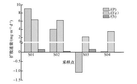 圖 4各采樣點(diǎn)P、Fe、S界面擴(kuò)散通量