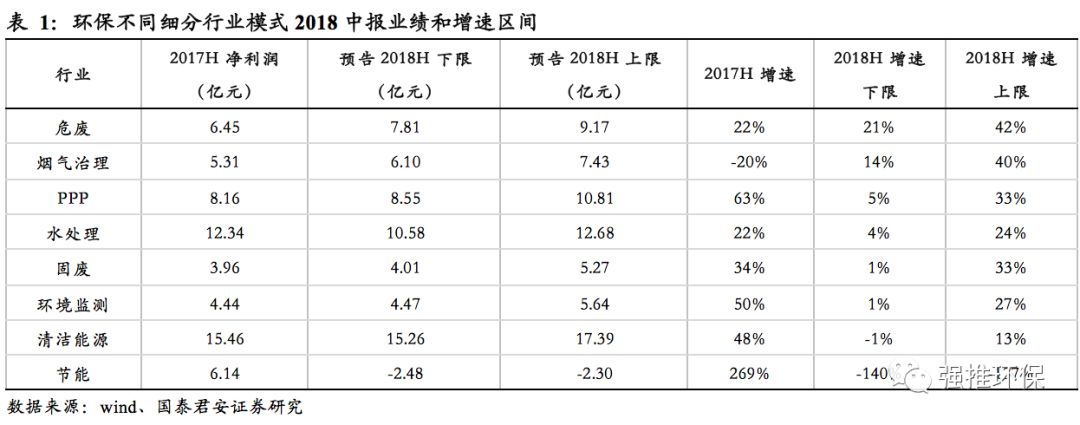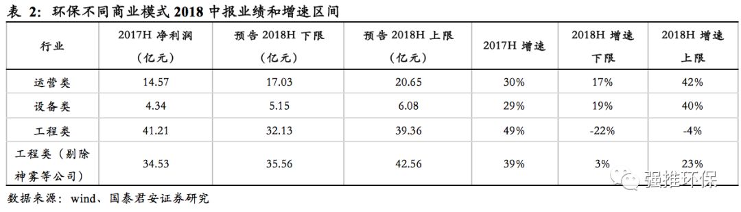 從細(xì)分子行業(yè)來看,危廢、煙氣治理、PPP、固廢、環(huán)境監(jiān)測、清潔能源、水處理、節(jié)能的增速區(qū)間分別為21%~42%、15%~40%、5%~33%、1%~33%、1%~27%、-1%~13%、-14%~3%、-140%~-137%??梢钥闯觯U板塊的增速下限已經(jīng)與2017年中報的增速持平,而以節(jié)能、清潔能源為主的細(xì)分板塊過去兩年帶領(lǐng)環(huán)保板塊增長的工程類模式增速出現(xiàn)了較大幅度的下滑,且PPP、水處理等細(xì)分板塊增速也有所放緩。