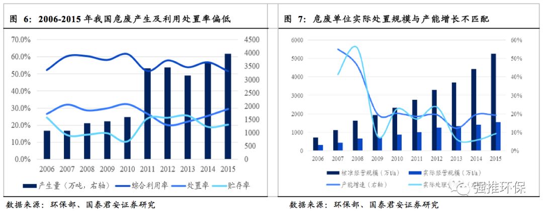 現(xiàn)有危廢資質(zhì)中,產(chǎn)能兌現(xiàn)比例低。2015年我國已核準(zhǔn)危廢處置產(chǎn)能總量5263萬噸,其中無害化982萬噸。按照2015年約1億噸危廢產(chǎn)量核算,產(chǎn)能缺口約為50%,而實(shí)際綜合利用+處置率約25%。其中顯著的差距主要來源于兩方面: