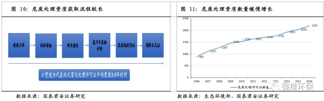 有進(jìn)入壁壘,有技術(shù)或管理優(yōu)勢。危廢處理行業(yè)管理采用許可證制度,沒有獲得許可證的企業(yè)不得進(jìn)行危廢處理。許可證的獲取需要經(jīng)過政府立項(xiàng)、環(huán)評審批、項(xiàng)目建設(shè)、省廳專家組評審、發(fā)放試生產(chǎn)證、領(lǐng)取正式證,以焚燒為代表的無害化處理許可證平均需要3~5時間。根據(jù)環(huán)保部2017年12月發(fā)布的《2017年全國大、中城市固體廢物污染環(huán)境防治年報》數(shù)據(jù),截至2016年底,全國共頒發(fā)危險廢物經(jīng)營許可證2195份,較2015年增加131份,增速6%,資質(zhì)增速緩慢。