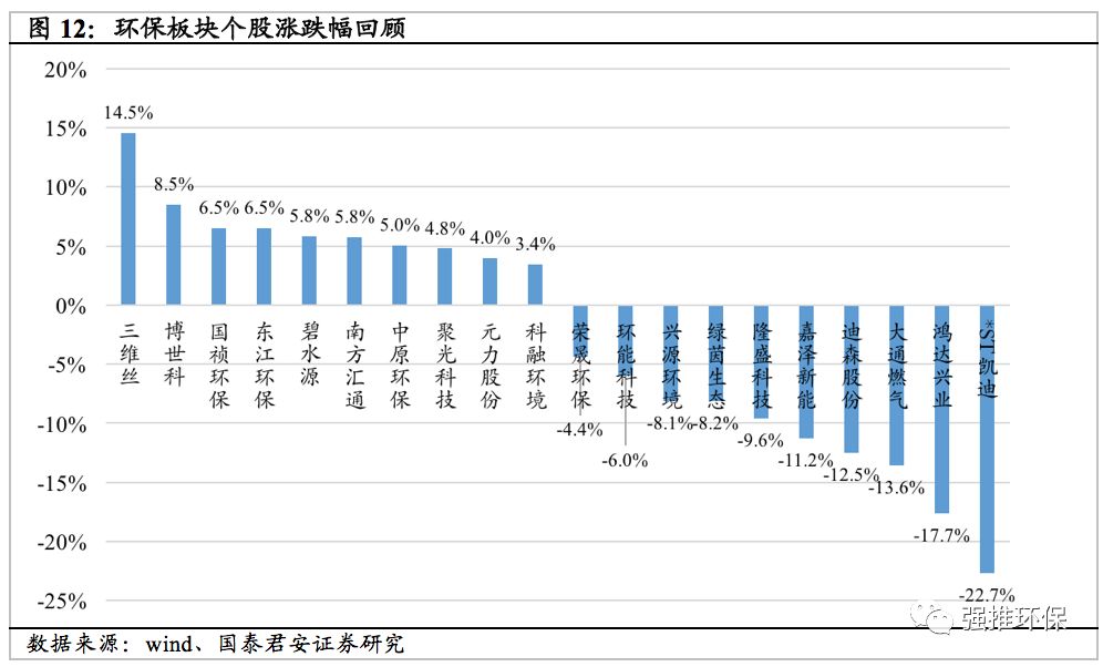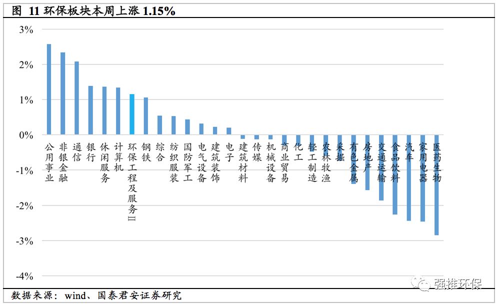 本周市場行情概覽:環(huán)保、燃?xì)?、水?wù)與電力板塊分別上漲1.15%、2.53%、0.50%與3.62%;其中環(huán)保板塊漲跌幅18/103;創(chuàng)業(yè)板指下跌0.55%,上證綜指下跌0.07%,深證成指下跌0.81%。漲幅前三名:三維絲(14.52%)、博世科(8.48%)、國禎環(huán)保(6.52%);漲幅后三名:*ST凱迪(-22.67%)、鴻達(dá)興業(yè)(-17.66%)、大通燃?xì)?-13.60%)。