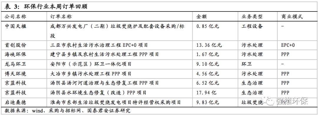 根據(jù)公告與招投標(biāo)信息統(tǒng)計,本周環(huán)保公司中新增訂單8單,金額合計63.83億元,其中兩項(xiàng)訂單金額達(dá)10億元以上(首創(chuàng)股份13.36、京藍(lán)科技17.94)。