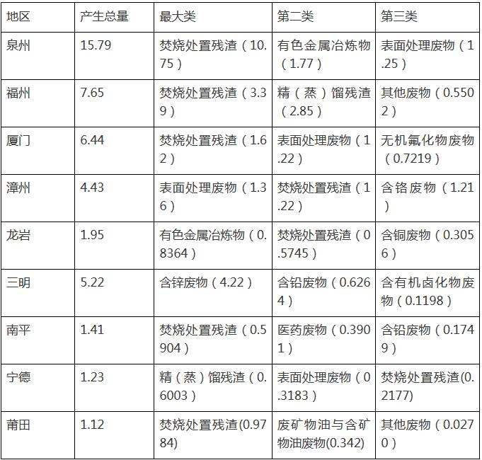 2016年福建省省危險廢物產(chǎn)生量合計為86.62萬噸,綜合利用量為56.27萬噸,處置量約為27.33萬噸,貯存量為14.11萬噸。福州市危險廢物產(chǎn)生總量為7.65噸,主要是焚燒處置殘渣3.39萬噸、精(蒸)餾殘渣2.85萬噸、其他廢物5502噸;寧德危險廢物產(chǎn)生量1.23萬噸,主要是精(蒸)餾殘渣6003噸、表面處理廢物3183噸、焚燒處置殘渣2177噸;龍巖危險廢物產(chǎn)生量1.95萬噸,主要是有色金屬冶煉物8364噸、焚燒處置殘渣5745噸、含銅廢物3056噸。