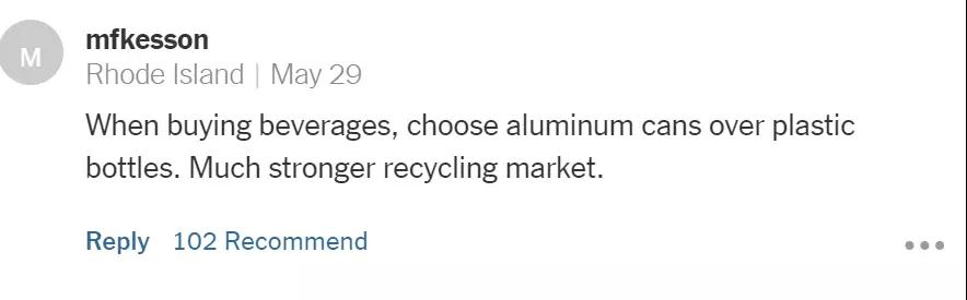 “當(dāng)我們買飲料時(shí),應(yīng)該盡量買那些鋁制罐裝的而不是塑料的。鋁材質(zhì)有著更強(qiáng)大的回收市場(chǎng)?!?/p>